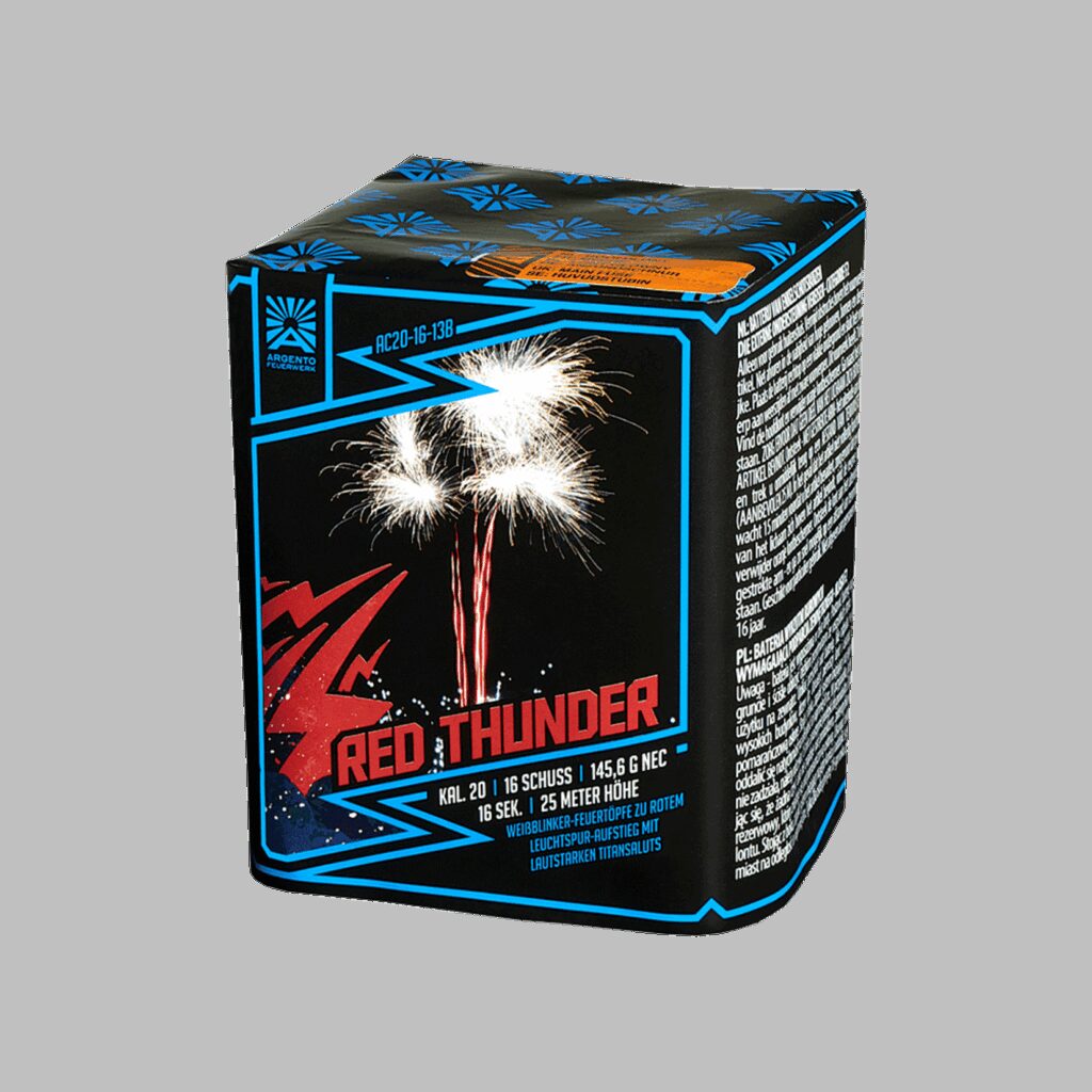 n nWitte knipperende vuurpotten naar rode tracer opstijging met luide titanium saluutschoten n n Argento Vuurwerk Red Thunder 16 Shots Goedkoop vuurwerk kopen bij Vuurwerkwinkel Badbentheim