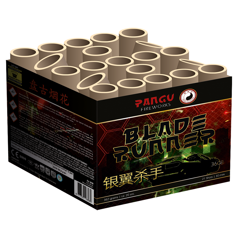 De Blade Runner van Pangu Fireworks is een 21 schots 30mm kaliber cake. Met zijn maximale kaliber, geschoten recht omhoog en in fanshape 3-breed een geweldige siercake. Deze Blade Runner schiet geweldig fijn gekleurde parels met het zeer geliefde fijne treurwilg effect op de achtergrond. Na dit sierlijke spektakel maakt de Blade Runner zich op voor de finale-sprint, waar hij zijn kunsten nogmaals in 5-breed laat zien!