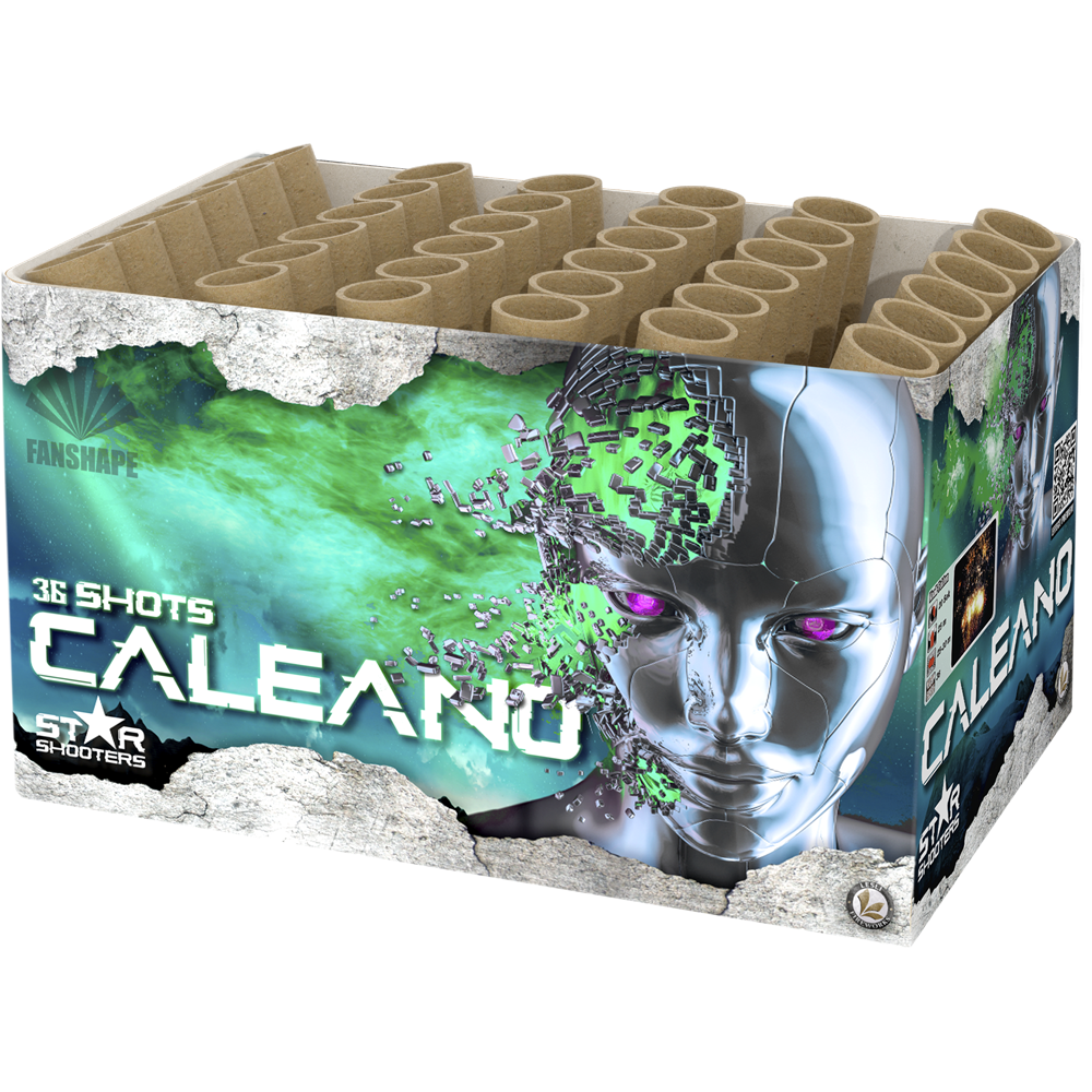 Caleano n nExtreem brede, knetterende batterij met 36 schoten in waaiervorm. Enkelvoudige verpakking n nKaliber 25 nAantal schoten 36 nBrand duur 20 Seconden